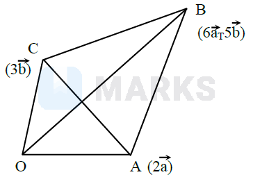 & =\frac{1}{2}|\overrightarrow{\mathrm{AC}} \times \overrightarrow{\mathrm{OB}}|=\frac{1}{2}|(3 \overrightarrow{\mathrm{b}}-2 \overrightarrow{\mathrm{a}}) \times(6 \overrightarrow{\mathrm{a}}+5 \overrightarrow{\mathrm{b}})| \\