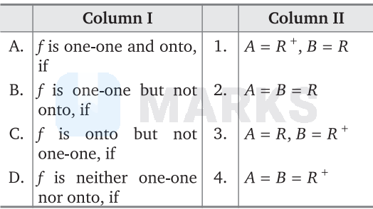 Let $R$ denote the set of all real numbers and $R^{+}$denote the set of all positive real numbers. For the subsets $A$ and $B$ of $R$ define $f: A \rightarrow B$ by $f(x)=x^2$ for $x \in A$. Observe the two lists given below