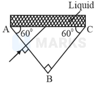 Light is incident normally on the face of a prism as shown in the figure. A layer of liquid of refractive index is applied on the face of the prism. If the prism is made of glass of refractive index , then the limit of for which total internal reflection takes place on face is