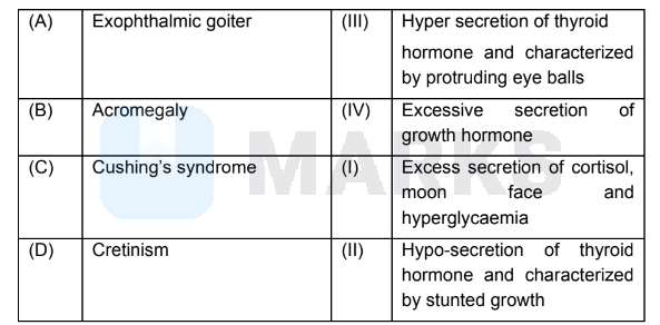 \begin{array}{|l|l|l|l|}\hline & List I & & List II \\\hline A. & Exophthalmic goiter & I. & Excess secretion of cortisol, moon face \& hypergylcemia. \\\hline B. & Acromegaly & II. & Hypo-secretion of thyroid hormone and stunted growth. \\\hline C. & Cushing's syndrome & III. & Hyper secretion of thyroid hormone \& protruding eye balls. \\\hline D. & Cretinism & IV. & Excessive secretion of growth hormone. \\\hline\end{array}