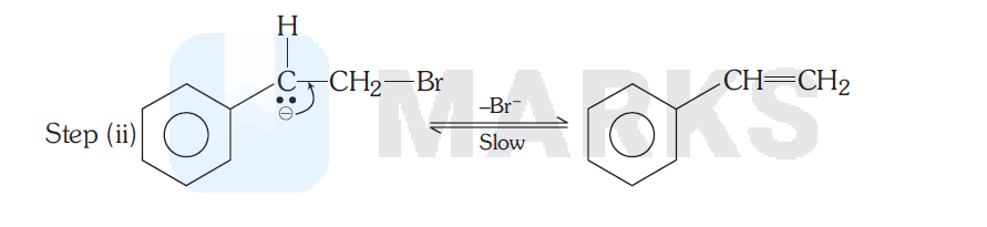 Step II. $\mathrm{PhCH}_2-\stackrel{+}{\mathrm{C}_2} \mathrm{H}_2 \stackrel{\text { Fast }}{\longrightarrow} \mathrm{Ph}-\mathrm{CH}=\mathrm{CH}_2+\mathrm{H}^{-}$