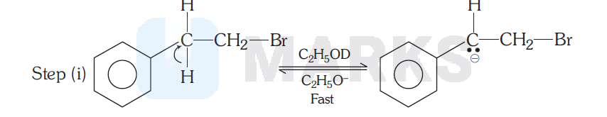 In the step (II), a slow unimolecular elimination occurs in the conjugate base of the reactant and hence this mechanism is called $E_1 C B$ or carbanion mechanism. Since step (I) must be reversible, if ethanol containing $\mathrm{C}_2 \mathrm{H}_5 \mathrm{OD}$ is used as solvent, it would be expected that the original bromide would incorporate deuterium (D).