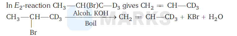 The formation of $\mathrm{CH}_2=\mathrm{CH}-\mathrm{CD}_3$ can be explained on the basis of the fact that $\mathrm{C}-\mathrm{D}$ bond is much stronger than $\mathrm{C}-\mathrm{H}$ bond.