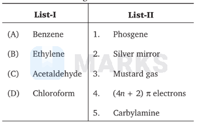 Benzene has $6 \pi$ electrons, i.e., it follows Huckel rule $(4 n+2) \pi$ electrons. Ethylene reacts with $\mathrm{S}_2 \mathrm{Cl}_2$ to give mustard gas (war gas). Acetaldehyde gives positive silver mirror test with Tollen's reagent and chloroform on oxidation gives phosgene (poisonous gas).