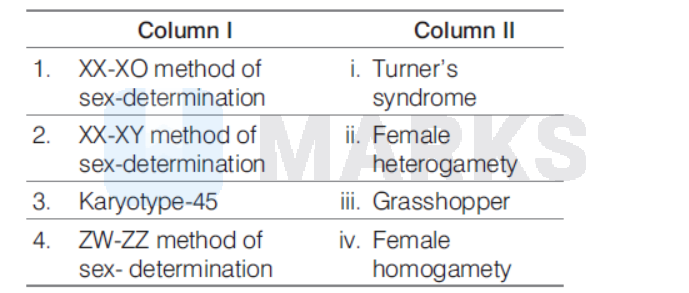 1. XX-XO method of sex-determination is seen in (iii) Grasshopper, where males have only one X-chromosome besides autosomes and females have a pair of $\mathrm{X}$-chromosome.