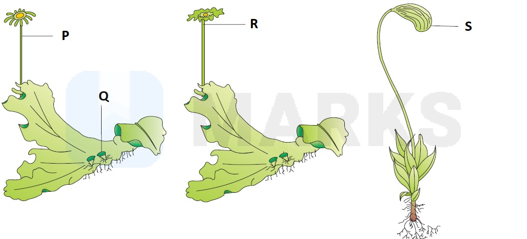 Observe the following figures and identify the structures or parts labelled as P, Q, R, and S.