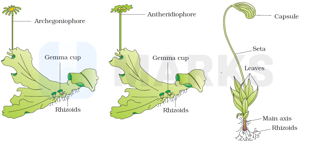 | Archegoniophore | Gemma cup | Antheridiophore | Capsule |