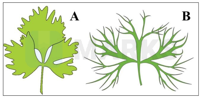 A is the leaf in terrestrial habitat while B is the leaf in aquatic habitat in buttercup. The difference in shapes of leaves produced in air and those produced in water in buttercup also represent the heterophyllous development due to environment. In cotton, coriander and larkspur, the leaves of the juvenile plant are different in shape from those in mature plants. This phenomenon of difference in leaf structure is called heterophylly. The ability of plants to follow different pathways in response to environment or phases of life to form different kinds of structures is called plasticity. Thus heterophylly is an example of plasticity.