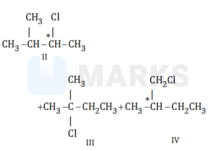 Mono chlorination of 2-methylbutane gives four isomers (I, II, III, IV)