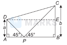 $P$ is a point on the segment joining the feet of two vertical poles of heights $a$ and $b$. The angles of elevation of the tops of the poles from $P$ are $45^{\circ}$ each. Then, the square of the distance between the tops of the poles is