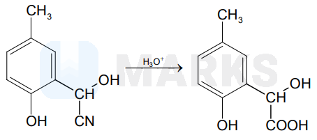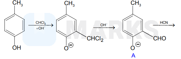 p-cresol reacts with chloroform in alkaline medium to give the compound A which adds hydrogen cyanide to form, the compound B. The latter on acidic hydrolysis gives chiral carboxylic acid. The structure of the carboxylic acid is