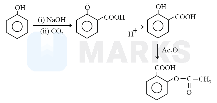 Phenol undergoes Kolbe’s Schmidt reaction in the presence of to form salicylic acid, which on further reaction with acetyl chloride produces aspirin.