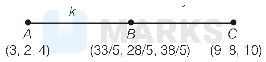 Let $B\left(\frac{33}{5}, \frac{28}{5}, \frac{38}{5}\right)$ divides $\overline{A C}$ in the ratio $k: 1$, where $A(3,2,4)$ an $d C(9,8,10)$.