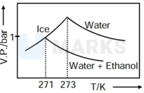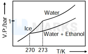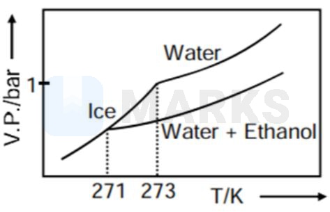 Pure water freezes at 273 K and 1 bar. The addition of 34.5 g of ethanol to 500 g of water changes the freezing point of the solution. Use the freezing point depression constant of water as 2 K kg . The figures shown below represent plots of vapour pressure (V.P.) versus temperature (T). [molecular weight of ethanol is 46 g ]