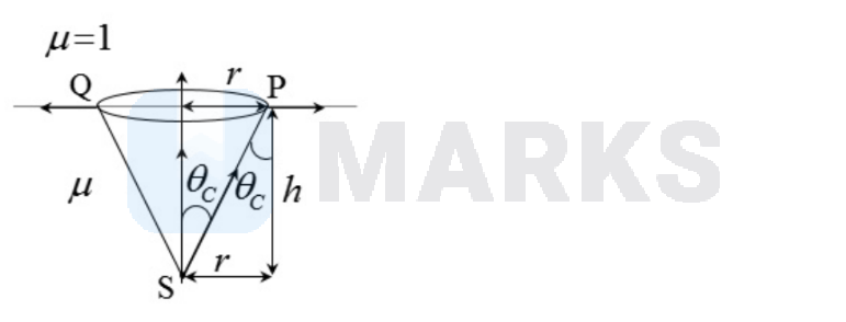 We know the patch forms due to total internal reflection. Light rays from source $S$ are incident at the edge of the circular path at critical angle $\theta_{\mathrm{C}}$ (as shown at points $\mathrm{P}$ and $\mathrm{Q}$ ), the refracted ray exits at angle $\frac{\pi}{2}$ w.r.t. the normal.