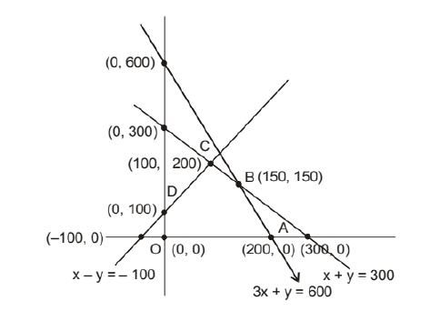 And the coordinates of corner points are $\mathrm{O}(0,0)$ $\mathrm{A}(200,0) \mathrm{B}(150,150), \mathrm{C}(100,200)$ and $\mathrm{D}(0,100)$