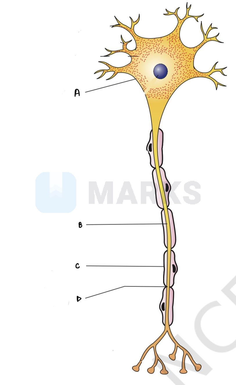 A, B, C, and D respectively are Cell body, Axon, Myelin sheath, Nodes of ranvier