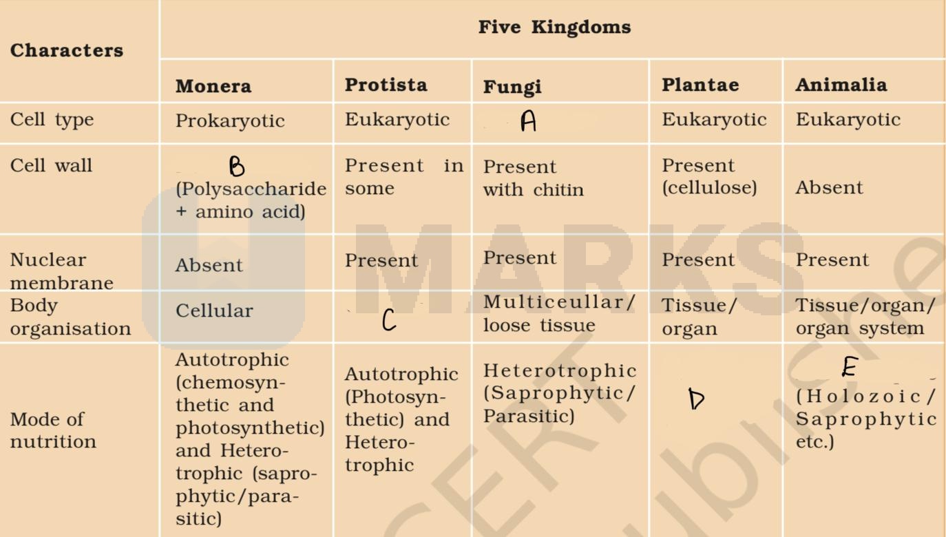 A, B, C, D and E are Eukaryotic, Non cellulosic, cellular, Autotrophic, Heterotrophic