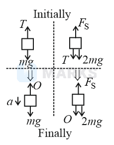 System shown in the figure is in equilibrium and at rest. The spring and string are massless, now the string is cut. The acceleration of mass and just after the string is cut will be