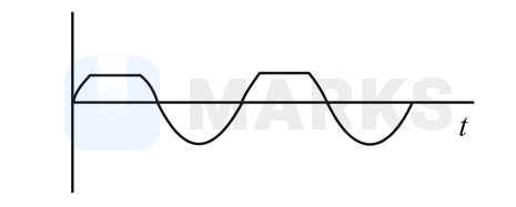 In this question, the potential difference is changing direction and there will be one diode in reverse biased always. Hence, every peak will have a cut section and the range of the output graph will be .