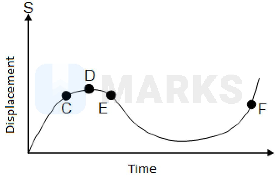 At the slope of the curve is negative, i.e. for a displacement-time graph the slope represents the velocity and at the velocity is as the slope is .