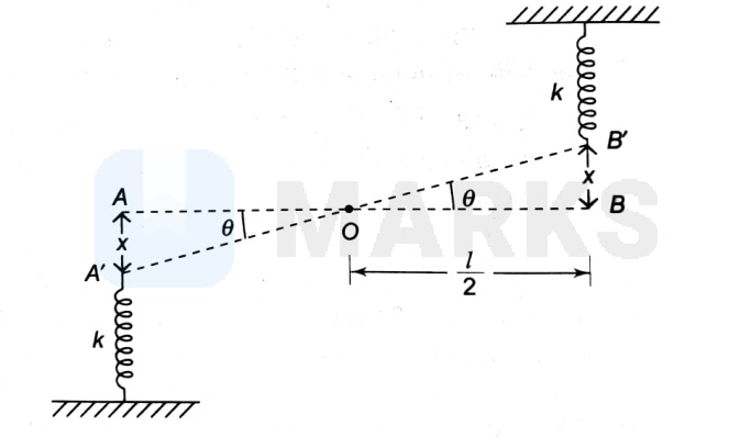 Let the rod be depressed by a small amount (in the figure). Both the springs are compressed by . When the rod is released, the restoring torque is given by