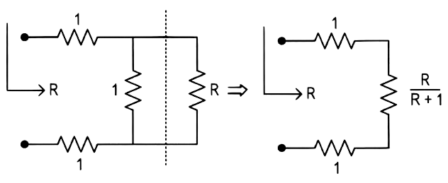 Now, \(R_{\text {net }}=R=1+1+\frac{R}{R+1}\)