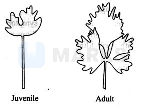 Every plant follows different pathways as a response to the environment, to form different structures, the ability to do so is called plasticity. Heterophylly in some plants is an example of the same. These plants have leaves that have a different shape when they are juvenile and the shape changes when they mature. The given figure depicts the heterophylly seen in larkspur when its juvenile and when they turn into an adult plant.