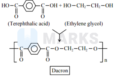 Condensation polymerization takes place between two bifunctional monomers, which results in the formation of high molecular mass condensation polymer. Dacron is obtained by the condensation polymerisation of ethylene glycol and terephthalic acid. It is an example of polyester.