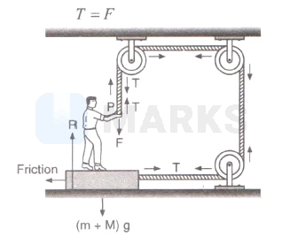 The friction coefficient between the board and the floor shown in diagram is . Find the maximum force that the man can exert on the rope, so that the board does not slip on the floor.