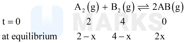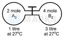 The gas A2 in the left flask allowed to react with gas B2 present in right flask as, ; Kc = 4 at 27oC. What is the concentration of AB when equilibrium is established?