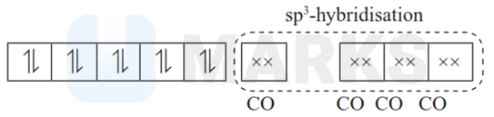 For, four ‘CO’-ligands hybridisation would be and thus the complex would be diamagnetic and of tetrahedral geometry as follows.