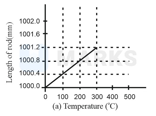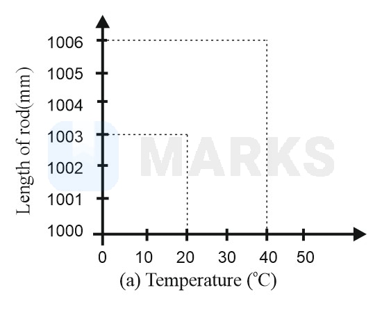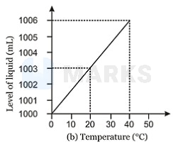 The graph of elongation of a rod of a substance with temperature rise is shown in the first graph. A liquid contained in a cylindrical vessel made out of substance (graduated in at is heated gradually. The readings of the liquid level in the vessel corresponding to different temperatures are shown in the second graph. The real coefficient of volume expansion of the liquid is
