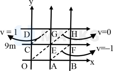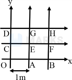 The grid represents a region in space containing a uniform electric field each square of size . If potentials at point , , , , , , , , are respectively , , , , , , , and volts. find the electric field intensity.