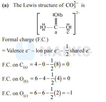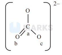 The incomplete Lewis representation of $\mathrm{CO}_3^{2-}$ is given below. The formal charge on atoms marked as a, b, and c, respectively, are