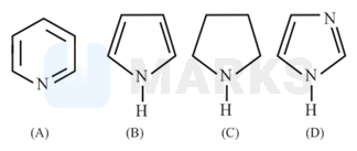 The basic nature of amines can be explained on the basis hybridisation. The basic nature order is . If the lone pair on nitrogen involved in resonance, then it is less basic than others. In the molecules A, B and D, the nitrogen is hybridised. In the pyrrole molecule the lone pair on nitrogen involving in conjugation to get aromaticity. Hence, C is most basic and B is least basic.