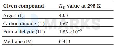 The $K_{\mathrm{H}}$ value ( $\mathrm{K}$ bar) of argon (I), carbondioxide (II), formaldehyde (III) and methane (IV) are respectively 40.3, 167, $1.83 \times 0^{-5}$ and $0.413$ at $298 \mathrm{~K}$. The increasing order of solubility of gas in liquid is