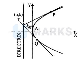 Let the two tangents to the parabola \(y^{2}=4 a x\) be \(P T\) and \(Q T\) which are at right angle to one another at \(\mathrm{T}(\mathrm{h}, \mathrm{k})\).