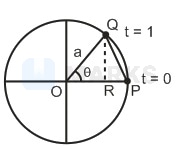 The magnitude of displacement vector of a particle which is moving in a circle of radius with constant angular velocity as a function of time is