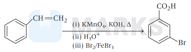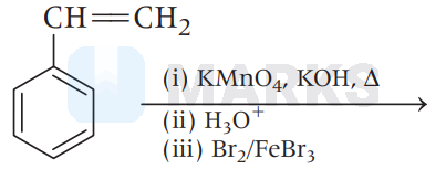 In step (i), we get oxidation product and in step (ii), when the product is treated with $\mathrm{Br}_2$ in presence of $\mathrm{FeBr}_3$ and $\mathrm{H}_3 \mathrm{O}^{+}$, we get meta-substituted substituted bromo-product as shown in the reaction.