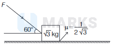 The maximun value of the applied force \(F\) such that the block as shown in the arrangement does not move is (Acceleration due to gravity, \(g=10 \mathrm{~ms}^{-2}\) )