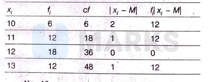 $\begin{aligned} N & =48 \\ \mathrm{MD} & =\frac{\Sigma f_i\left|x_i-M\right|}{N}=\frac{36}{48}=0.75\end{aligned}$