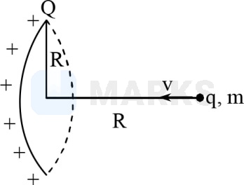 The minimum velocity with which charge should be projected so that it manages to reach the centre of the ring starting from the position shown in figure is