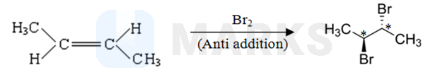 As addition of is anti and trans-2-butene is used so meso form of 2,3-di-bromo-butane is formed which has 2 chiral carbon atoms.