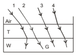 The optical density of turpentine is higher than that of water while its mass density is lower. Figure shows a layer of turpentine floating over water in a container. For which one of the four rays incident on turpentine in figure, the path shown is correct?