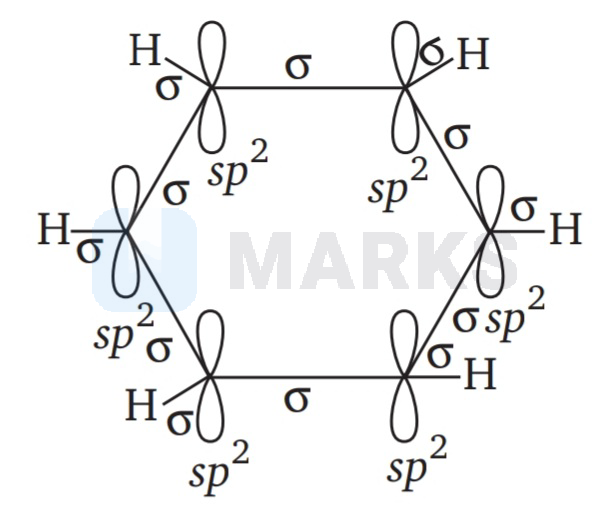 The molecular orbital picture of benzene shows that in it all the six carbon atoms are $\mathrm{sp}^{2}$ hybridised. Out of these three ${s p^{2}}^{2}$ hybrid orbitals of each C atom, two orbitals overlap with $\mathrm{sp}^{2}$ hybrid orbitals of adjacent $C$ atoms to form six $\mathrm{C}-\mathrm{C}$ single bonds. The remaining $\mathrm{sp}^{2}$ orbital of each $C$ atom overlaps with -orbital of each hydrogen atom to form six $\mathrm{C}-\mathrm{H}$ single sigma bonds. Each C atom is now left with one unhybridised -orbital perpendicular to the plane of the ring.