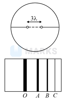 The position of the direct image obtained at , when a monochromatic beam of light is passed through a plane transmission grating at normal incidence is shown in figure. The diffracted images and correspond to the first, second and third order diffraction. When the source is replaced by another source of shorter wavelength
