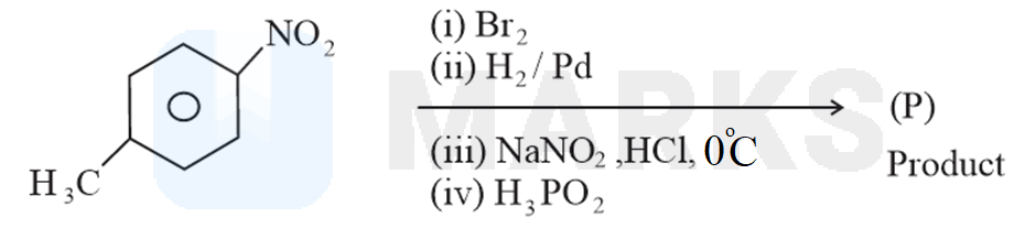 The first step of the sequence is involved with electrophilic substitution reaction. Nitro group is deactivating group and methyl group is activating group, hence, the substitution reaction takes place with respect to methyl group. In the second step nitro group is reduced to amine group with hydrogen in the presence of palladium metal. The aniline undergo diazotisation in the third step.The diazonium salt loses nitrogen gas in the presence of .