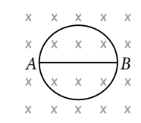 The radius of the circular conducting loop shown in figure is $R$. Magnetic field is decreasing at a constant rate $\alpha$. Resistance per unit length of the loop is $\rho$. Then current in wire $A B$ is ( $A B$ is one of the diameters)