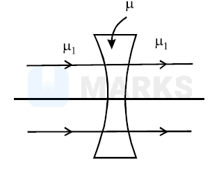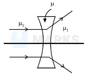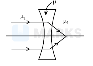 If $\mu_1>\mu$, then $\mathrm{f}_{\mathrm{m}}$ and $\mathrm{f}_{\mathrm{a}}$ have opposite signs and the nature of lens changes i.e. a convex lens diverges the light rays and concave lens converges the light rays. Thus given option (a) is correct.